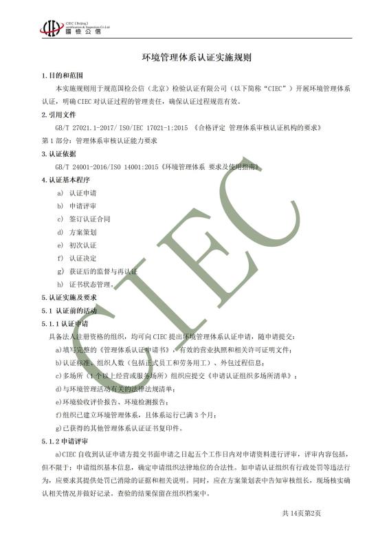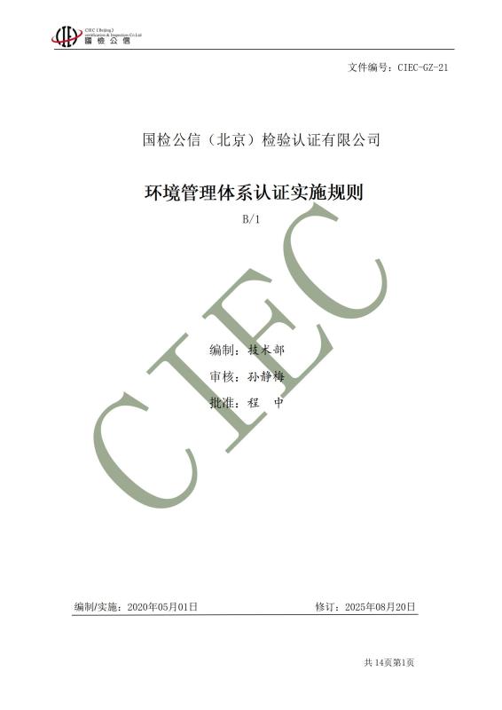 文件編號:CIEC-GZ-21 環(huán)境管理體系認(rèn)證實施規(guī)則 版本:B/1認(rèn)證依據(jù):GB/T 24001-2016/ISO 14001:2015《環(huán)境管理體系 要求及使用指南》本認(rèn)證規(guī)則歸國檢公信( 北京 )檢驗認(rèn)證有限公司所有 , 對其擁有最終解釋權(quán) 。如需獲取相關(guān)規(guī)則全文,請與以下聯(lián)系方式獲?。?電話:010-64938770 郵箱:CIEC1671@163.com;