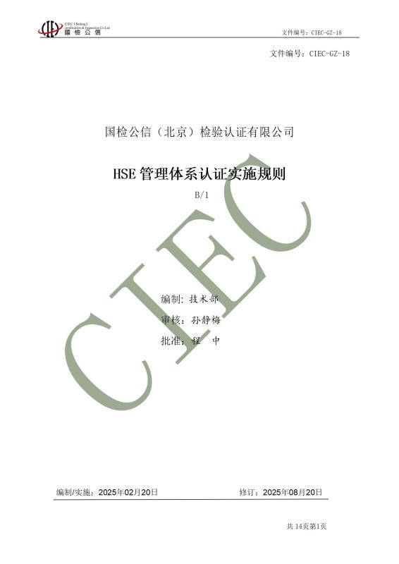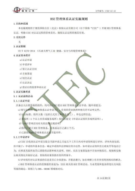 文件編號(hào):CIEC-GZ-18 HSE管理體系認(rèn)證實(shí)施規(guī)則 版本:B/1認(rèn)證依據(jù):SY/T 6276-2014《石油天然氣工業(yè) 健康、安全與環(huán)境管理體系》本認(rèn)證規(guī)則歸國(guó)檢公信( 北京 )檢驗(yàn)認(rèn)證有限公司所有 , 對(duì)其擁有最終解釋權(quán) 。如需獲取相關(guān)規(guī)則全文,請(qǐng)與以下聯(lián)系方式獲?。?電話:010-64938770 郵箱:CIEC1671@163.com;